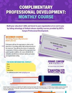 Build your educators’ skills and invest in your organization at no cost to you by taking advantage of limited-release, monthly courses provided by GCU’s Canyon Professional Development.