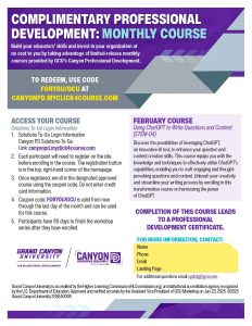 FreeBuild your educators’ skills and invest in your organization at no cost to you by taking advantage of limited-release monthly courses provided by GCU’s Canyon Professional Development.