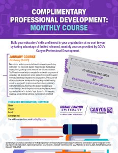 Build your educators’ skills and invest in your organization at no cost to you by taking advantage of limited-release, monthly courses provided by GCU’s Canyon Professional Development.