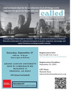 $15Join us for a morning of inspiration, connection, and equipping at LIFT – an outreach ministry of Christian Educators and part of a national movement to protect, empower, encourage, and equip Christians working in public education.