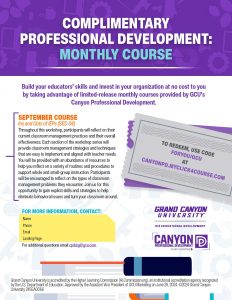 FreeBuild your educators’ skills and invest in your organization at no cost to you by taking advantage of limited-release, monthly courses provided by GCU’s Canyon Professional Development.