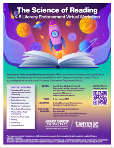 Join Canyon Professional Development (Canyon PD) for the “Science of Reading” virtual synchronous workshop. This series fulfills 45 hours toward Part A of the K-5 literacy endorsement. Canyon PD is an approved provider for the Arizona K-5 Literacy Endorsement Requirement (Part A).