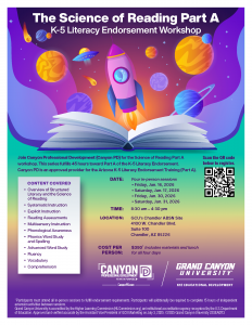 Join Canyon Professional Development (Canyon PD) for the “Science of Reading” workshop. This series fulfills 45 hours toward Part A of the K-5 Literacy Endorsement. Canyon PD is an approved provider for the Arizona K-5 Literacy Endorsement Training (Part A).