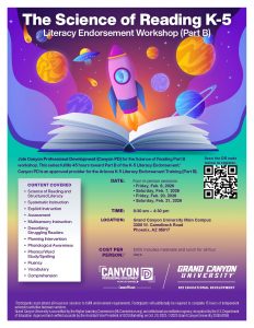 Join Canyon Professional Development (Canyon PD) for the Science of Reading Part B workshop. This series fulfills 45 hours toward Part B of the K-5 Literacy Endorsement. Canyon PD is an approved provider for the Arizona K-5 Literacy Endorsement Training (Part B).